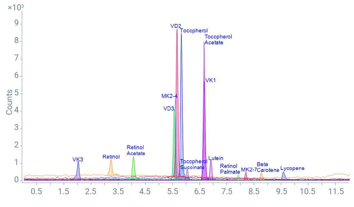 복잡한 식품 매트릭스에서 모든 지용성 비타민과 카로티노이드를 정량화하려면 LC‑ UV및LC/MS/MS분석법이 모두 필요한 경우가 많습니다. 식품 시료에 비타민 A와 E가 풍부하게 존재하면 MS검출기 포화가 발생할 수 있으며, 다이오드어레이검출기(DAD)와 결합된 HPLC를 사용하여야 합니다.