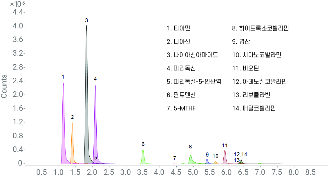 <InfinityLab Poroshell 120 Aq-C18, 3.0 × 100 mm, 2.7 μm 컬럼을 사용한 수용성 비타민 분리>