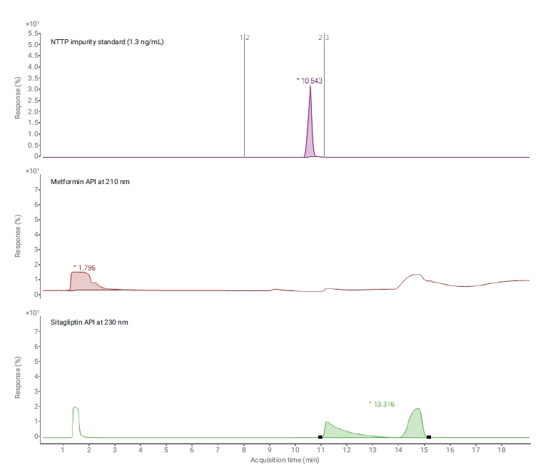 NTTP 표준물질(1.3 ng/mL)에 대한 대표 MRM 크로마토그램과 메트포르민 및 시타글립틴에 대한 DAD 크로마토그램